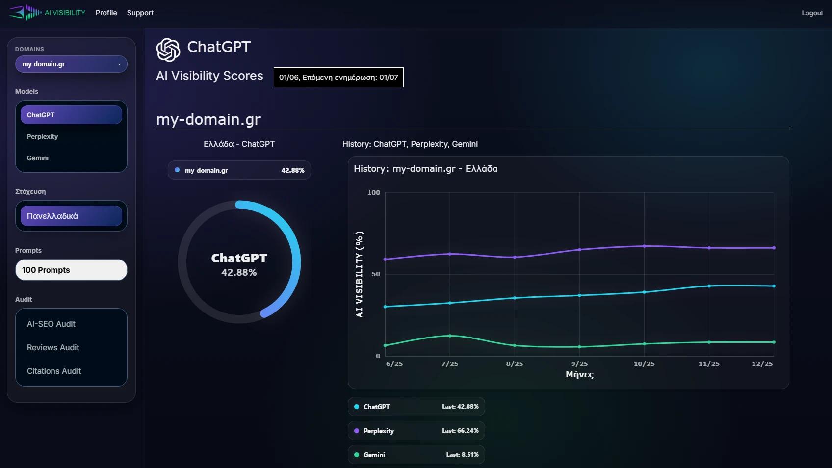 Παίρνεις 3 scores (ChatGPT, Gemini, Perplexity). Σύγκριση με τον ανταγωνισμό μήνα-μήνα.